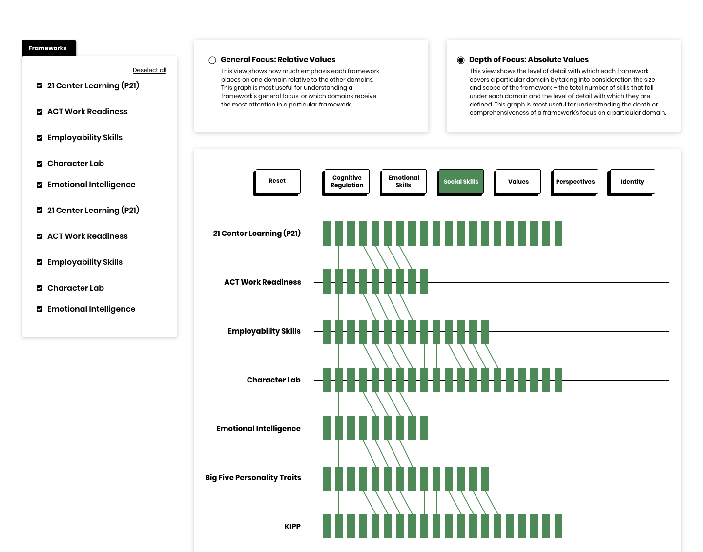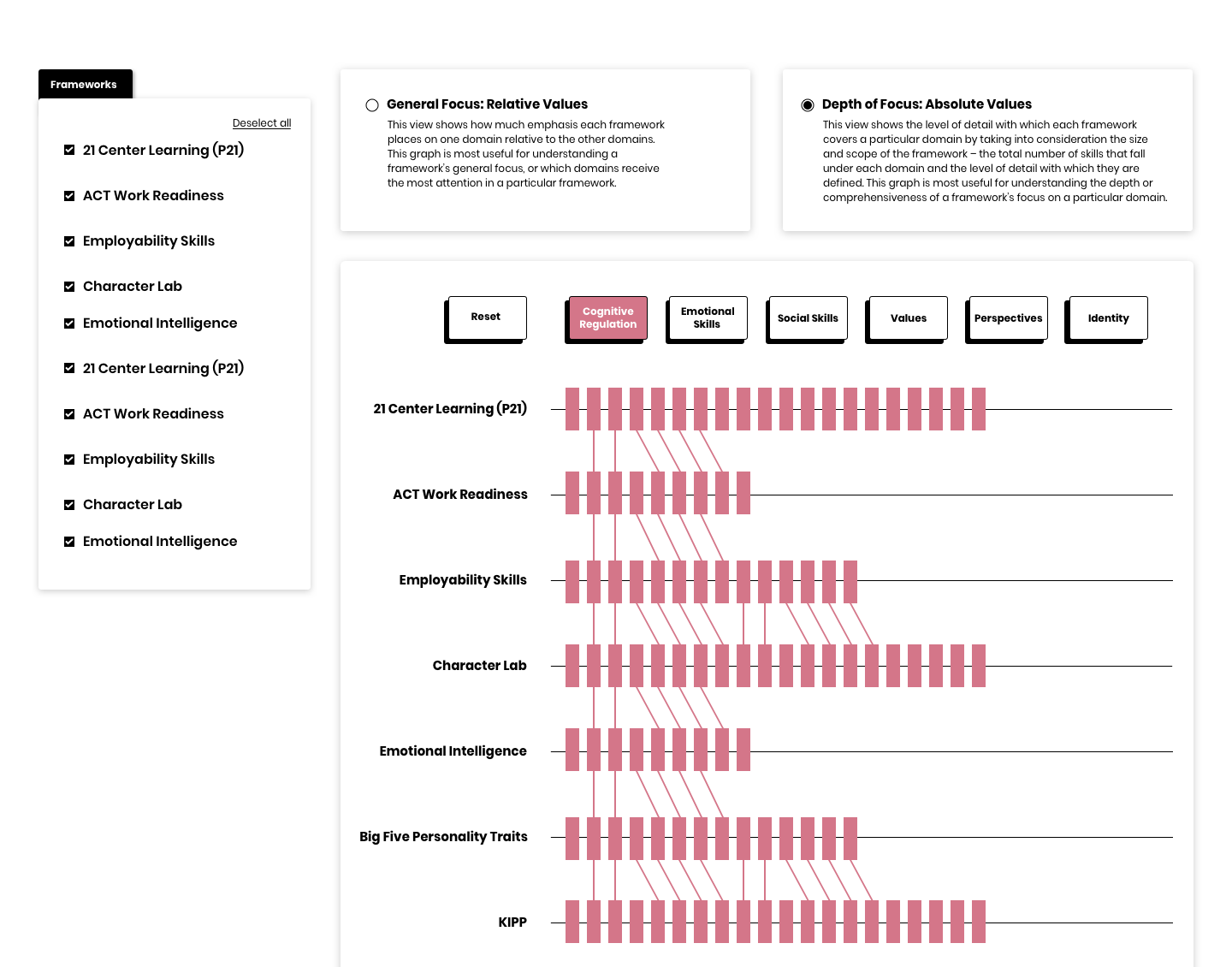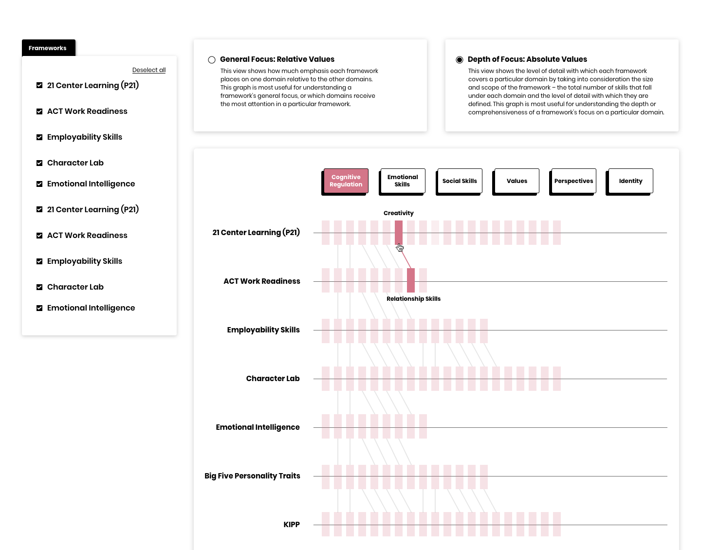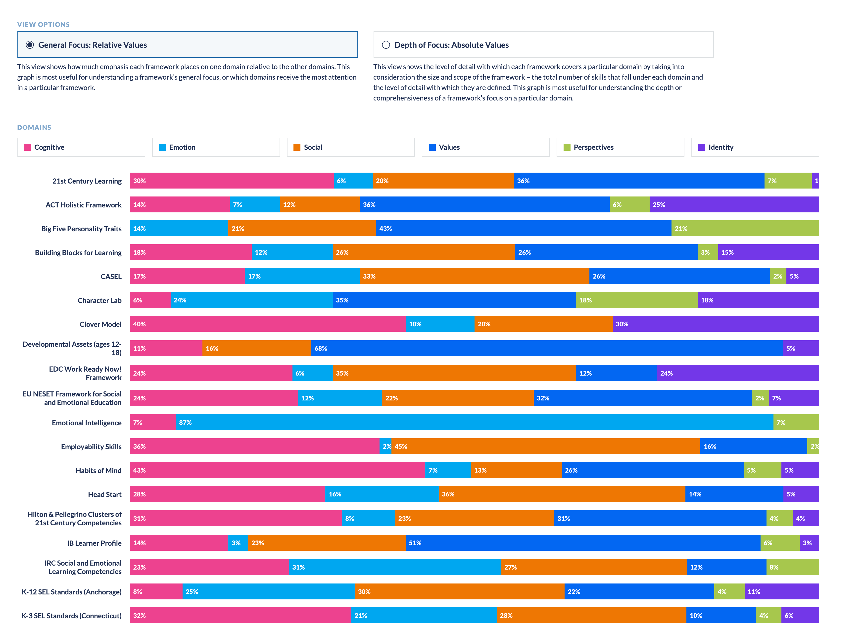 This view shows how much emphasis each framework places on one domain relative to the other domains. This graph is most useful for understanding a framework’s general focus, or which domains receive the most attention in a particular framework.