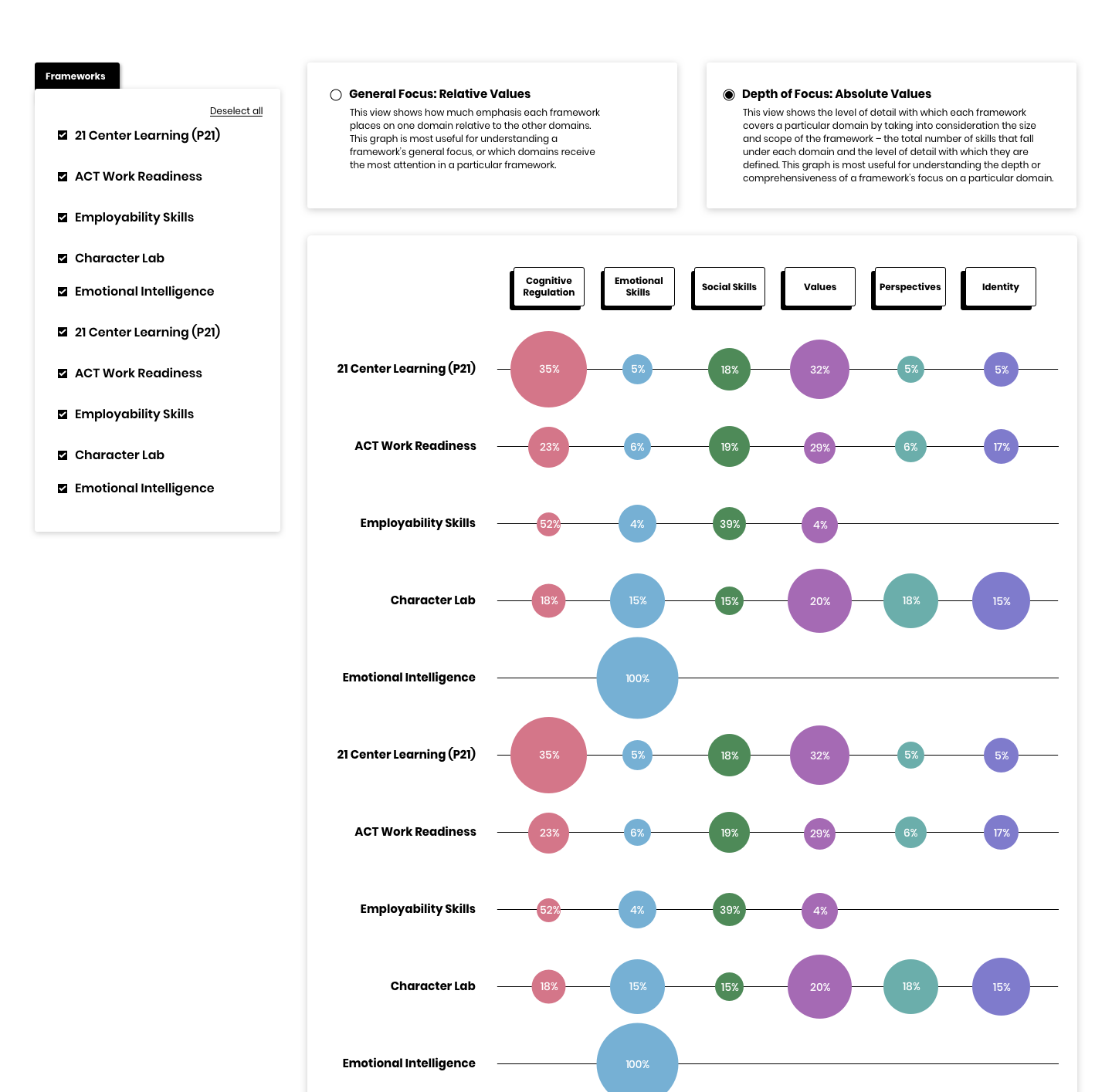 This view shows the level of detail with which each framework covers a particular domain by taking into consideration the size and scope of the framework – the total number of skills that fall under each domain and the level of detail with which they are defined. This graph is most useful for understanding the depth or comprehensiveness of a framework’s focus on a particular domain.