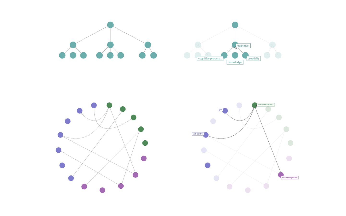 Users can select a framework from each list to see where terms in the left framework are related to terms in the right one – based on their definitions rather than their names. The thicker the line, the more related the terms.