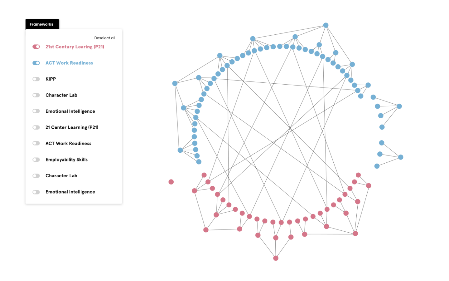 Users can click on a skill in the sunburst or select from a list of 100+ common skills to highlight related skills across frameworks.