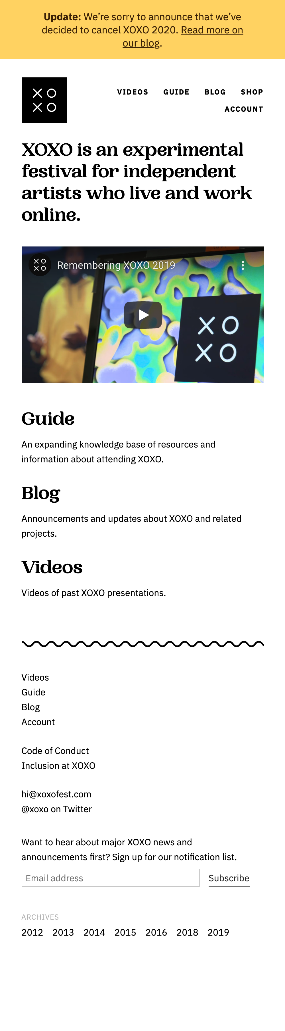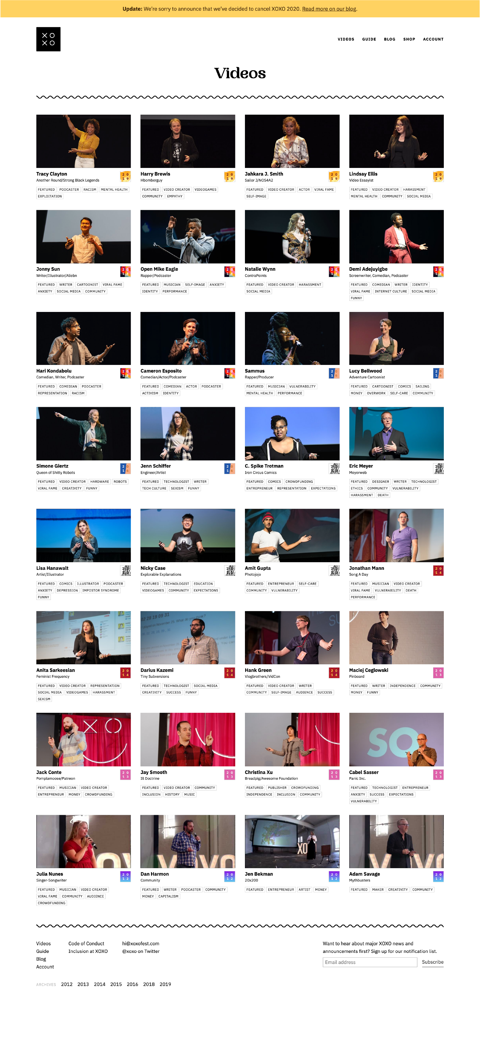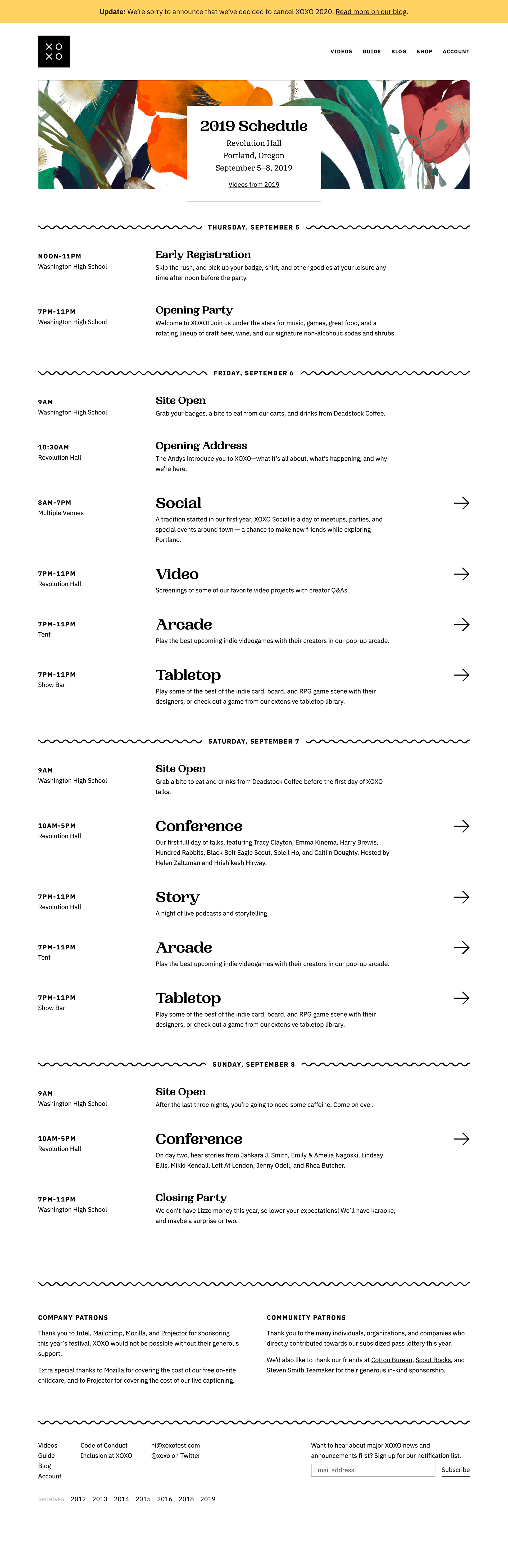 Read more about XOXO Festival →XOXO Festival didn't have a dedicated website that stored all the information holistically. Instead, year-by-year, they would build separate websites to host necessary information (past and future festivals).