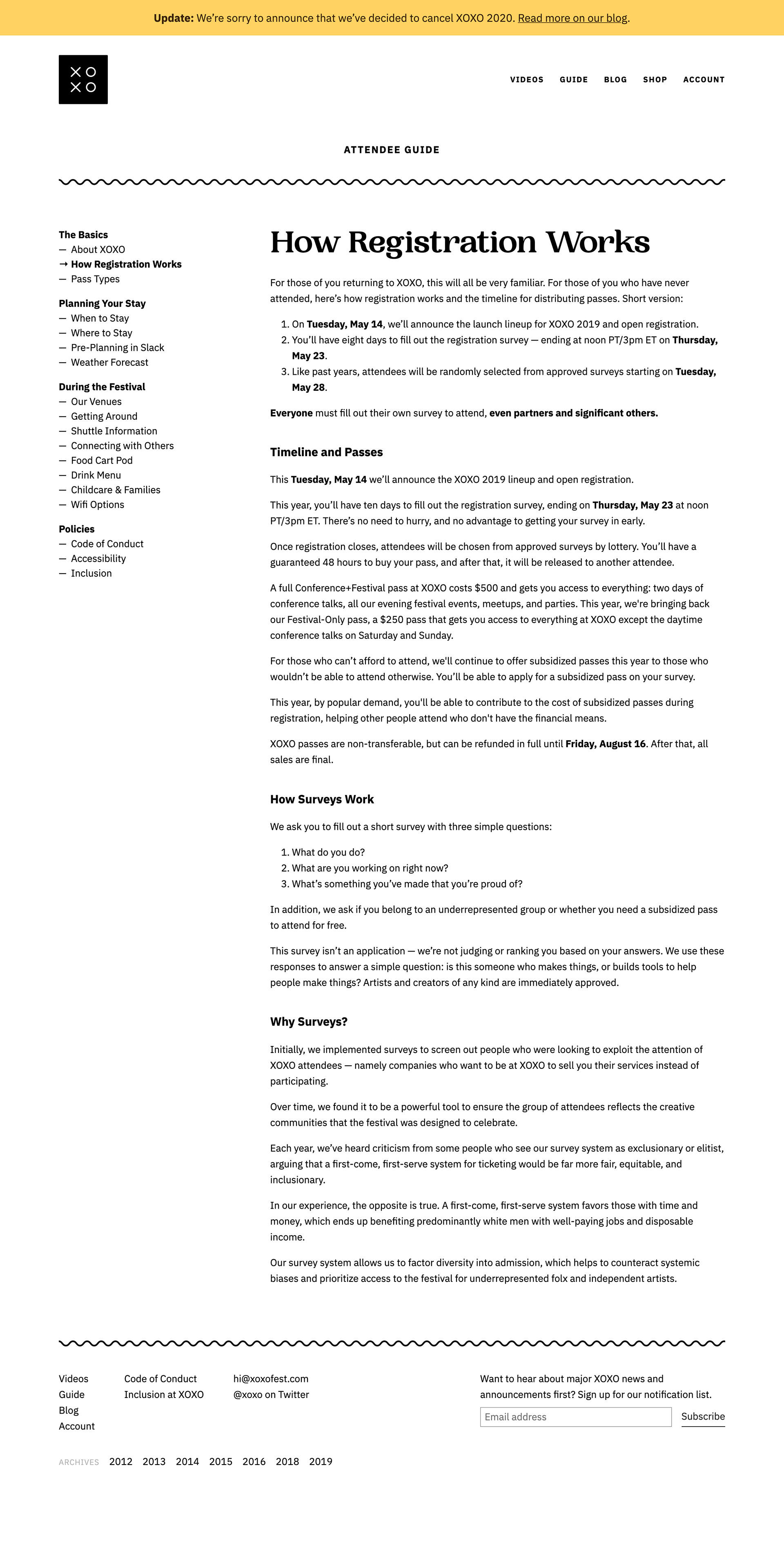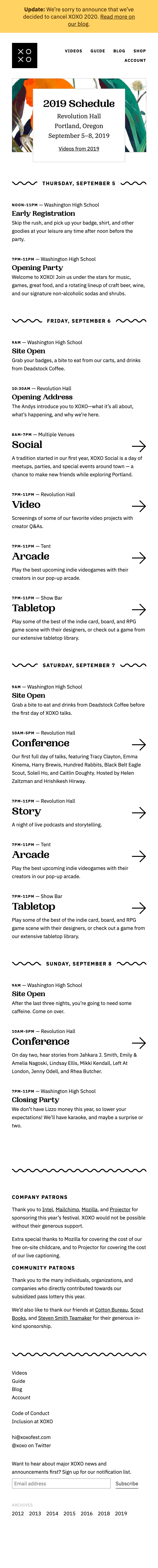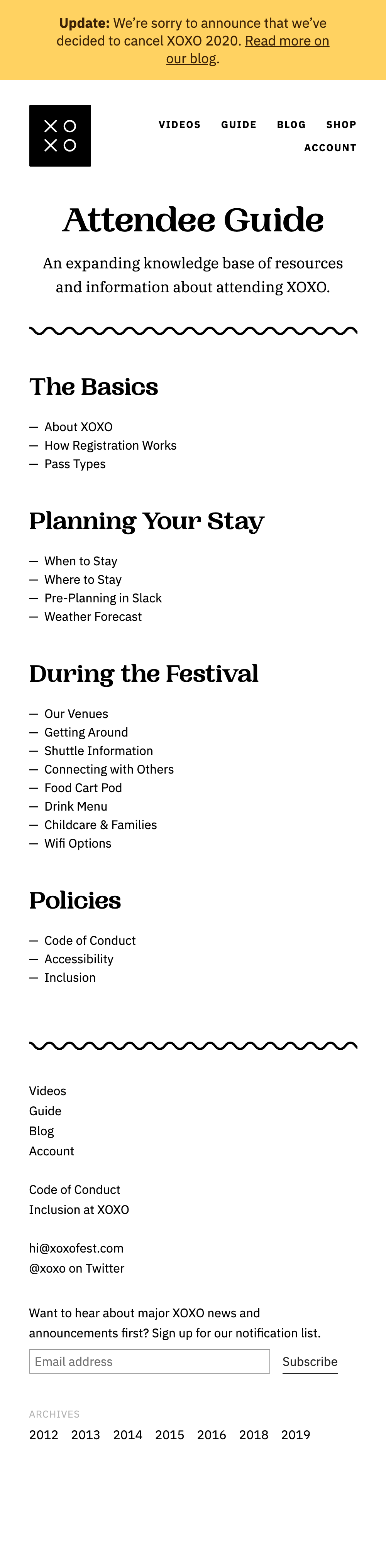 Read more about XOXO Festival →XOXO Festival didn't have a dedicated website that stored all the information holistically. Instead, year-by-year, they would build separate websites to host necessary information (past and future festivals).