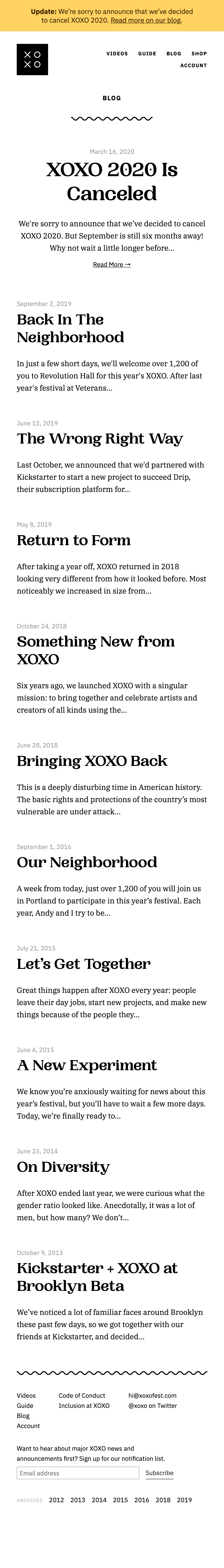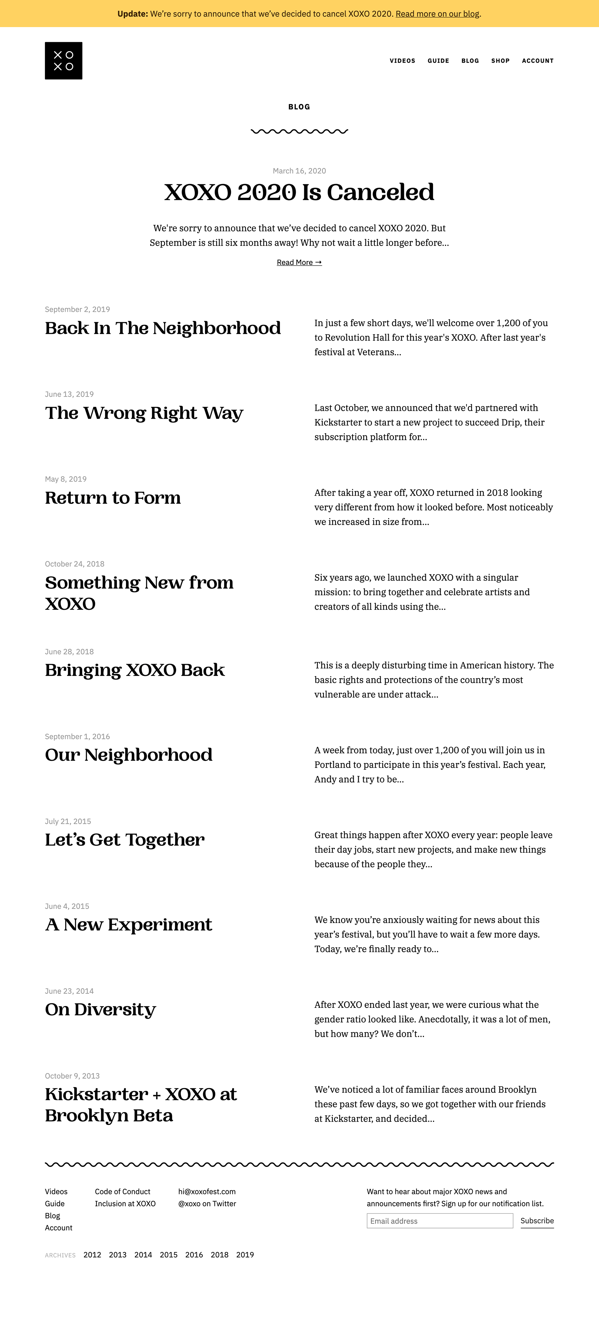 The most recent blog post will always be on the top with different design treatment. We decided to call more attention to the most recent post because there is a huge following for XOXO Festival updates from attendees and non-attendees. XOXO doesn't use images for blog posts so we had to heavily rely on typographic layout.