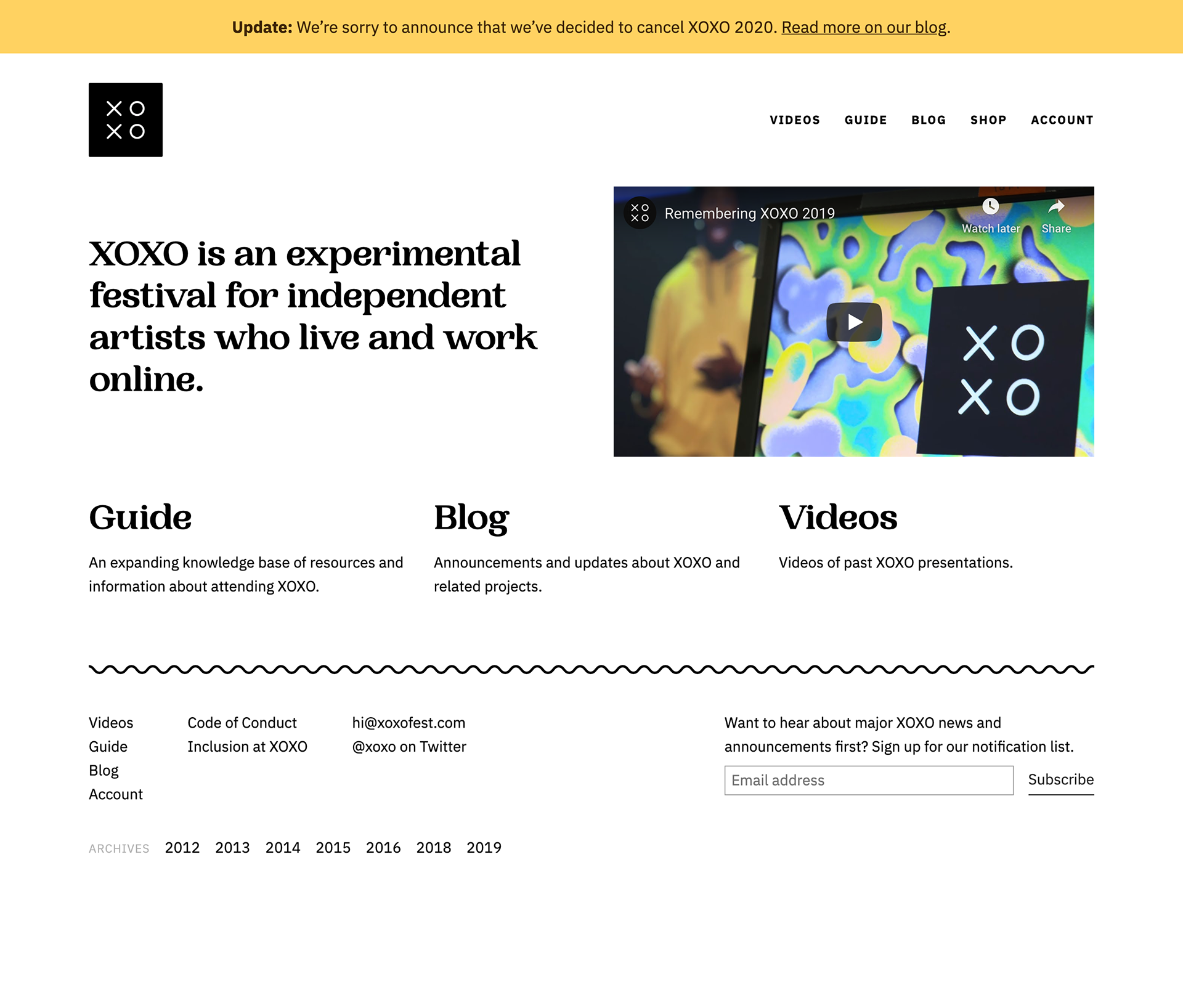 ✌ VIEW SITE →"XOXO is an experimental festival celebrating independent artists and creators working on the internet. Each year, XOXO brings together writers, designers, filmmakers, musicians, game developers, coders, cartoonists, and more to share their stories and struggles of living and working online.More than anything, XOXO focuses on the emotional experience of making things online, with difficult subjects including financial insecurity, anxiety, depression, mental health, impostor syndrome, burnout, racism, sexism, and online harassment."
